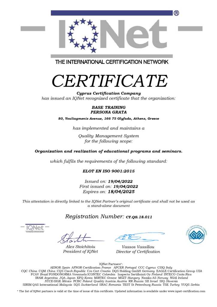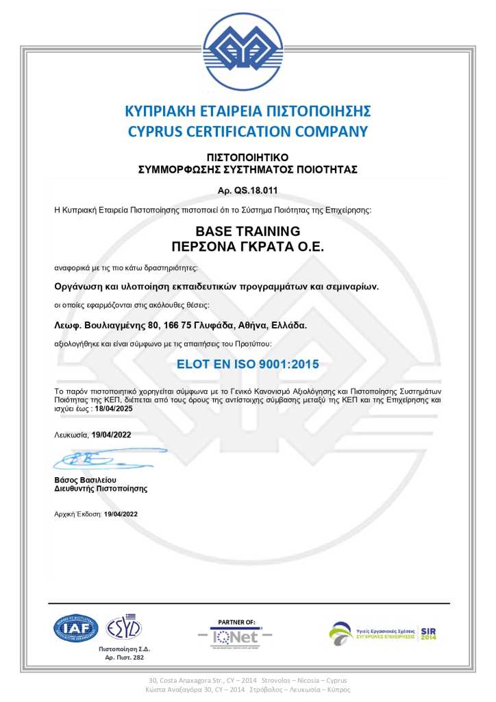 Με πιστοποίηση επίσης προτύπου ISO 9001:2015, η base training αποδεικνύει τη δέσμευσή της στην ποιότητα και στην πλήρη ικανοποίηση των μελών της, καθώς και την προσήλωσή της στις υψηλού επιπέδου εκπαιδευτικές υπηρεσίες.