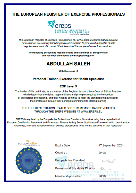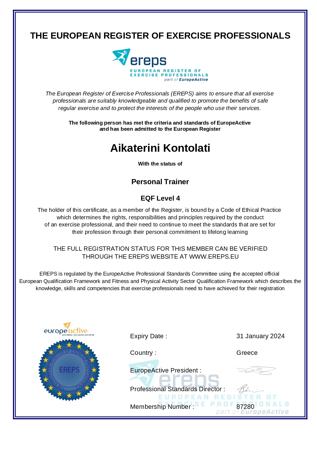 Η Πιστοποίηση EREPS δίνεται από τον Europe Active (http://www.europeactive.eu/) , τον κορυφαίο –μη κερδοσκοπικό- οργανισμό που αντιπροσωπεύει ολόκληρο τον Ευρωπαϊκό τομέα υγείας, φυσικής και σωματικής κατάστασης. Τα μέλη καταχωρούνται στη λίστα των διαπιστευμένων επαγγελματιών, η οποία είναι καταχωρημένη στο επίσημο SITE (https://www.ereps.eu/) κι έχουν το δικαίωμα άσκησης επαγγέλματος σε 28 χώρες της Ευρωπαϊκής Ένωσης.