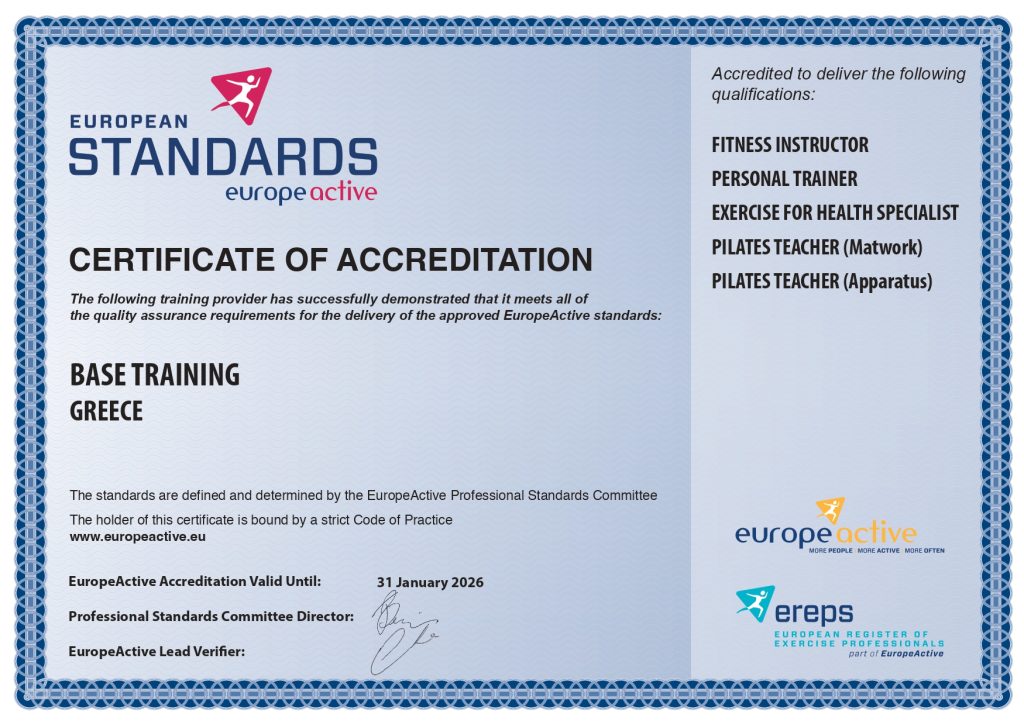 In the EU, however, the law allows EREPS level 4 certification holders to work in any fitness facility. Base Training is an active partner of EREPS and can assist students in obtaining an EREPS certification.