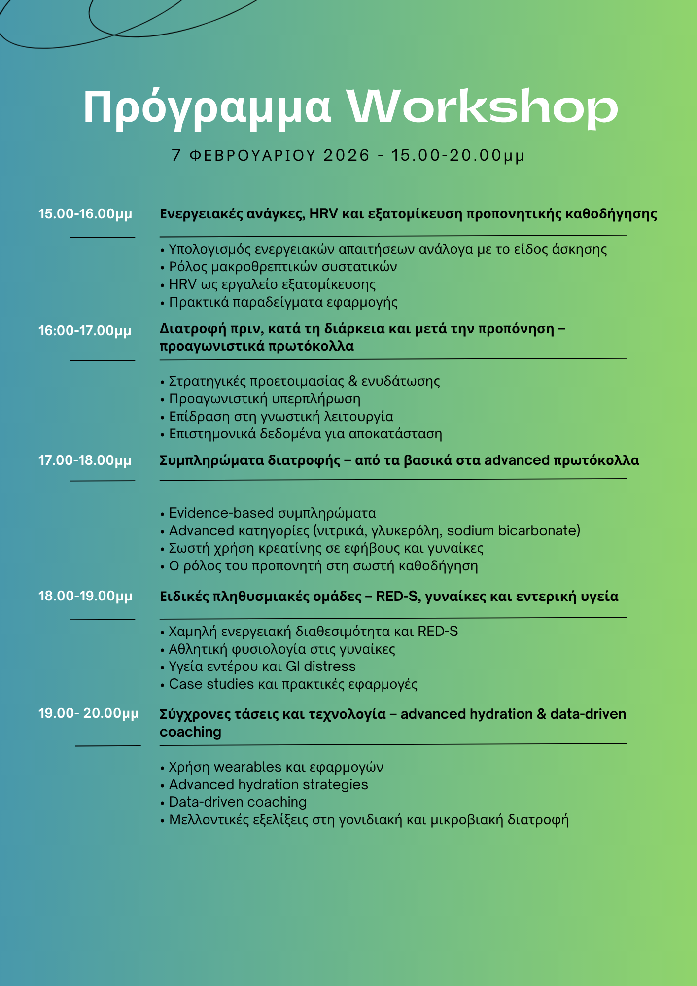 Το εργαστήριο Sports Nutrition & Human Performance προσφέρει επιστημονικά τεκμηριωμένη γνώση και πρακτικά εργαλεία που μπορούν να εφαρμοστούν άμεσα σε αθλητές κάθε επιπέδου αλλά και ασκούμενους που τους ενδιαφέρει να βελτιώνονται μέσα από την προπόνηση.